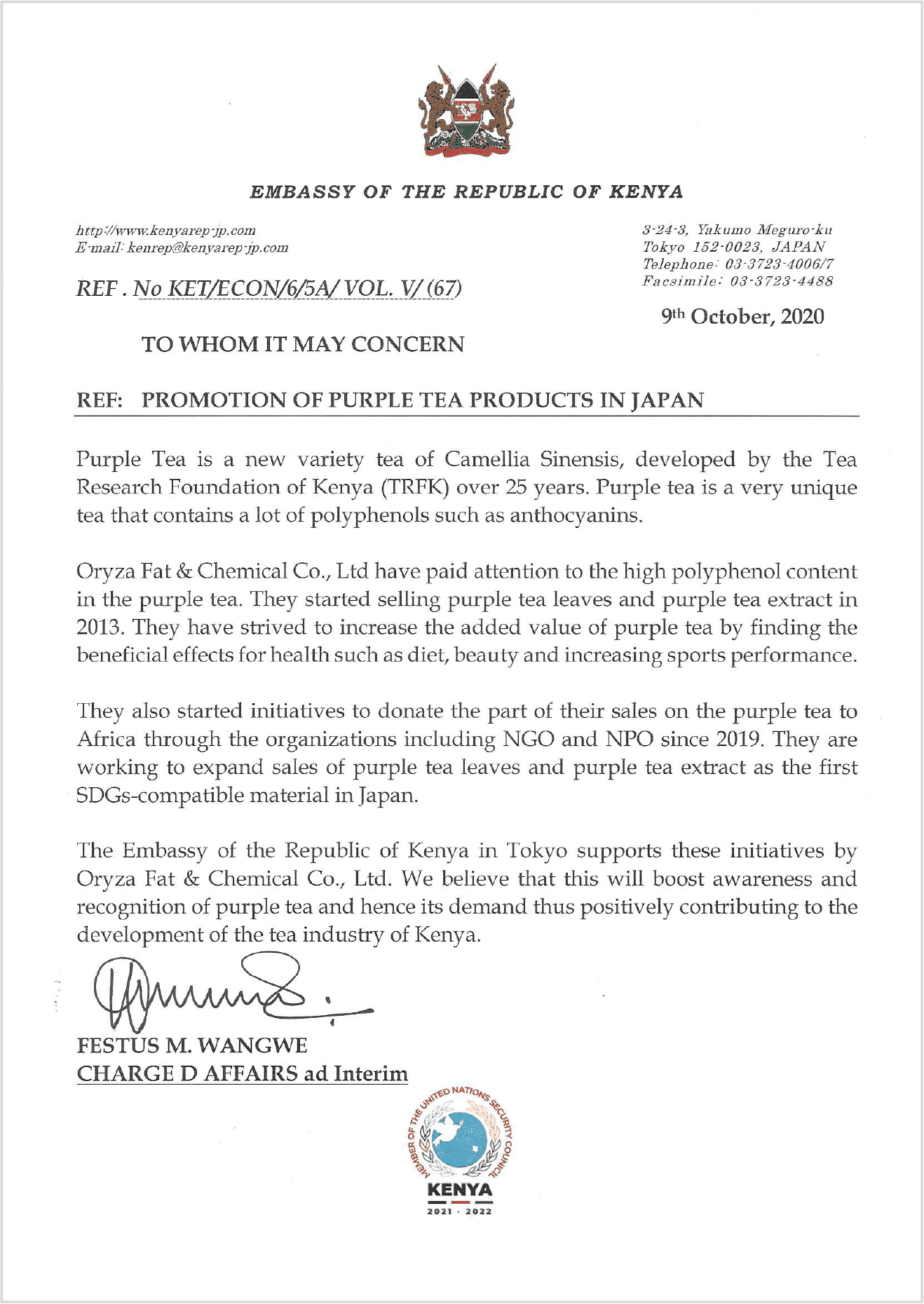 ケニアの総人口の7%、300万人の生計を支えているお茶産業ですが、茶葉の収量の不安定さや価格低下、低付加価値により、農家が受け取る収入も低水準で不安定なことが問題になっています。さらに、生産量の90%以上を紅茶が占めているがゆえに供給過多による茶葉価格低下や為替の影響をダイレクトに受けてしまうことも課題だそうです。そんな状況を改善していくために、付加価値の高い他品目へと生産を多様化していく取り組みがされています。その1つが、ケニア茶葉研究財団(TRFK)が25年の歳月をかけ、ケニアの自立を願い開発された“紫茶”なのです。オリザ油化では、紫茶の高いポリフェノール量に着目。優れた機能性を見出すことで、紫茶のさらなる付加価値向上に努めています。このように、紫茶の魅力を広げていくことで、アフリカへの支援につなげたいと考えています。こうしたオリザ油化の紫茶に対する取り組みは、ケニア大使館もサポートしてくれています。