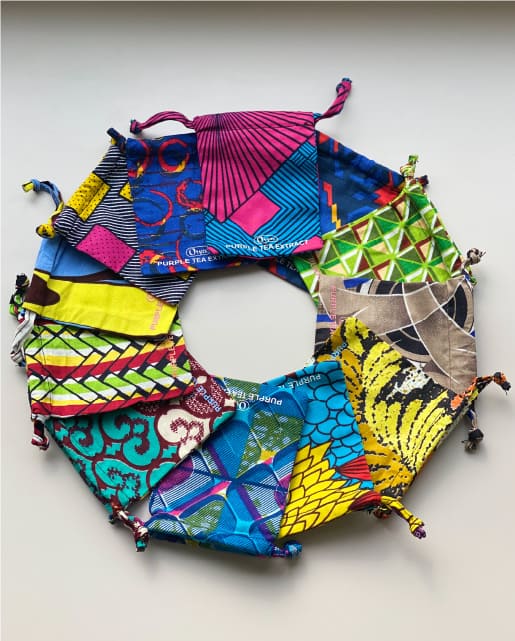 オリザ油化では『紫茶、アフリカ支援プロジェクト』を広くPRするため、NPO法人Dooooooooにアフリカファブリックを使った巾着500枚の製作を依頼、5名の従業員に対して5日間の労働を提供することができたそうです。1人あたり10,000円/5日間の収入になったとのこと報告がありました。(ガーナの縫製を職にしている人たちの月収は5,000円程度