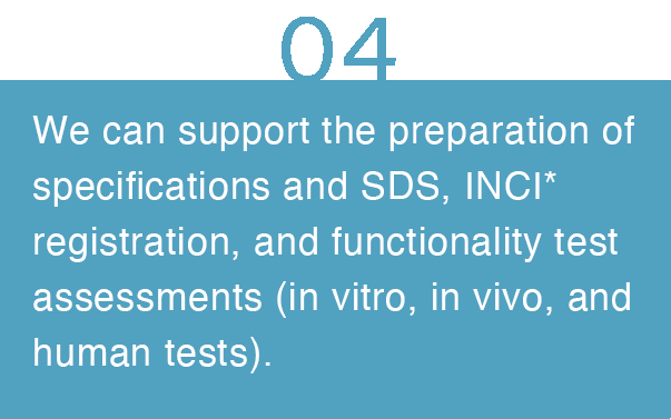 We provide comprehensive support from product design and manufacturing to functionality assessments and market development for food and cosmetic ingredient production.